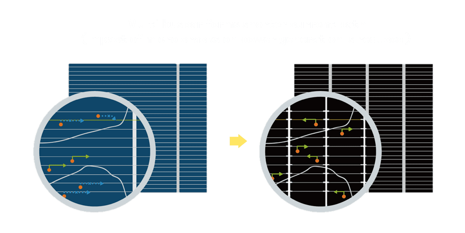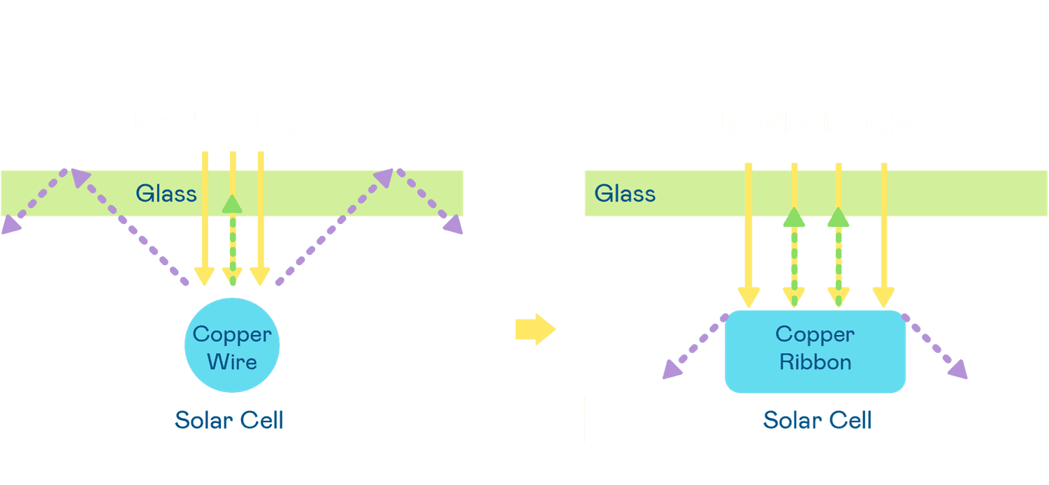 - 电池使用多条铜导线 (Copper wire) 于电池片上形成较短的电流路径,,提高电流收集效率,,,采用圆形设计的铜导线较传统扁平式的铜焊带 (Ribbon),,可增加入射至电池的光线量。。。