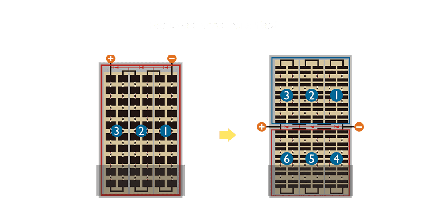 - 结合半切电池,,,降低遮阴影响、、提升模组抗隐裂能力、、、并减少电阻损耗,,,,进一步提升模组发电效能。。